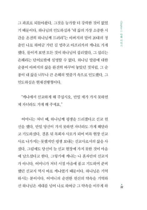 이제는 모든 것이 하나님의 영광을 위한 것이라는 뜻을 매일 조금씩 더 깨닫고 있습니다. 하나님이 사용하실 때 저는 가장 빛이 납니다. ‘하나님께서 평생 사용하실 수 있는 삶을 나에게 주셨구나’라는 생각을 할 때마다 제가 얼마나 사랑받고 있는지 놀라게 됩니다. 하나님께서 부르시는 곳이 아프리카가 아니라 다른 어디라도 순종할 수 있는 것은, ‘하나님께서 또 다른 선물을 주고 싶으시구나’ 하고 기대할 수 있기 때문입니다. 그 선물들이 모여 비전이 되고 하나님께 영광이 되길 소망합니다. (72쪽)