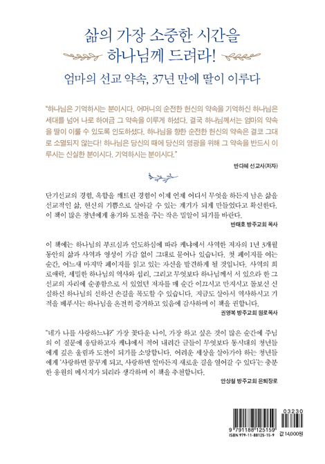 가장 꽃다운 나이, 가장 하고 싶은 것이 많은 순간에 주님의 이 질문에 응답하고자 케냐에서 적어 내려간 이 글들이 무엇보다 동시대의 청년들에게 깊은 울림과 도전이 되기를 소망합니다. 어려운 세상을 살아가야 하는 청년들에게 ‘사랑하면 꿈꾸게 되고, 사랑하면 얼마든지 새로운 길을 열어갈 수 있다’는 충분한 응원의 메시지가 되리라 생각하며 이 책을 추천합니다. 이 땅의 그리스도인 청년들이 마음과 생각이 새로워지고 다른 시선을 가지는 기회가 되어 그들이 준비된 삶과 열정으로 선교지를 주의 마음으로 품는 일들이 일어나기를 소망합니다.