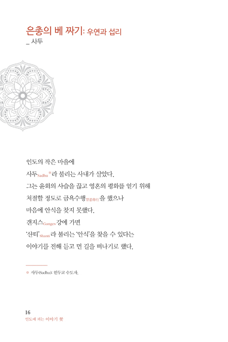하나님은 영혼의 평화를 찾아 방황했던 힌두교 사두와 그의 아들 그리고 길에 버려진 여자아이의 삶을 ‘은총의 베 짜기’를 통해 서로 만나게 하시고 씨실과 날실 같은 운명으로 하나님의 계획 속에서 서로의 삶을 완성시켜 가셨다.