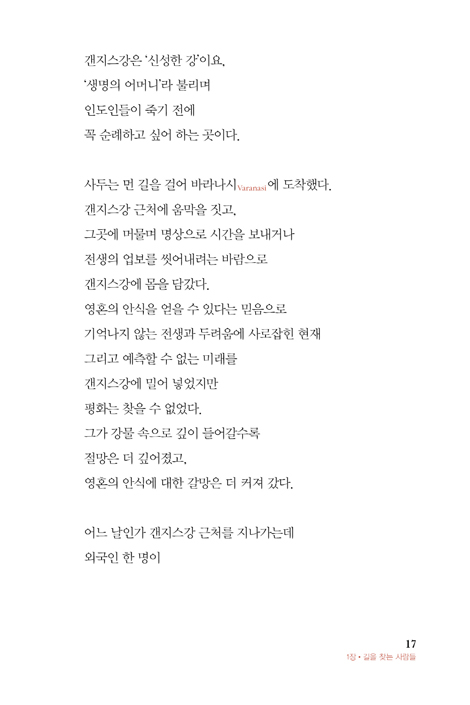17년간 나그네로, 선교사로 인도의 길을 걸으면서 현지 그리스도인들이 치열하게 만들어 낸 믿음의 이야기를 듣거나 그들이 남긴 흔적들을 보았다. 하나님의 성령이 보통 사람들과 동행한 이들의 이야기는 지금도 진행형이고, 아직도 인도의 골목과 산골짜기, 도시와 바다의 경계에서 계속 이어지고 있다. 인생의 치열함 속에서 눈물 흘리고, 고난 속에서 선택하고, 핍박과 차별 속에서 소망의 삶을 살아 낸 사람들의 이야기는 가장 낮은 자리에서 하나님과 동행한 흔적이고 하나님이 응답한 역사이기에 소중한 사람에게 들려주는 마음으로 기록했다.