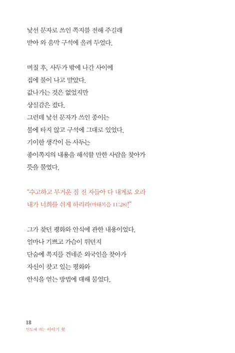 윌리엄 캐리나 선다 싱과 같은 위대한 신앙인들의 이야기는 이미 많이 소개되어 있고, 설교 예화로도 자주 사용되고 있다. 그러나 기독교 신앙 때문에 목숨을 거는 인도 불가촉천민들의 위대한 신앙 이야기는 한국 교회에 거의 소개되어 있지 않다. 이에 인도에서 17년간 사역하면서 인도 교회 가운데 전해지는 아름다운 신앙 이야기를 접한 저자는 그들이 예수 때문에 선택한 믿음의 이야기와 무명 선교사들이 헌신한 흔적들을 찾아 글로 기록하였다.
