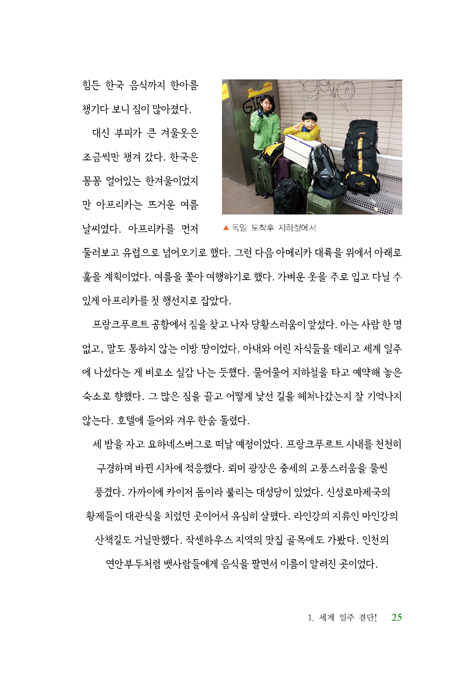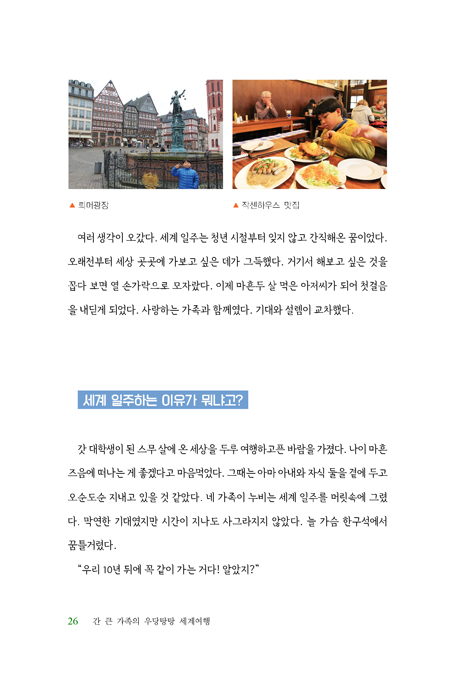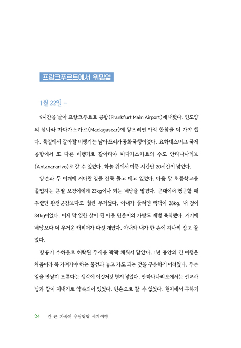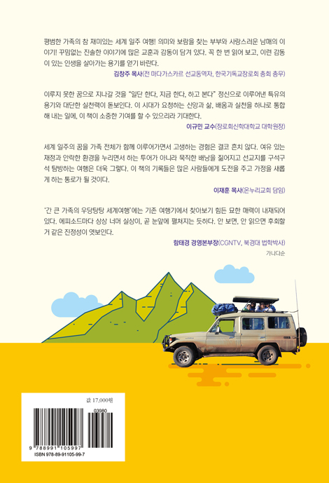 세계 일주의 꿈을 가족 전체가 함께 이루어가면서 고생하는 경험은 결코 흔치 않다. 여유 있는 재정과 안락한 환경을 누리면서 하는 투어가 아니라 묵직한 배낭을 짊어지고 선교지를 구석구석 탐방하는 여행은 더욱 그렇다. 이 책의 기록들은 많은 사람들에게 도전을 주고 가정을 새롭게 하는 통로가 될 것이다.