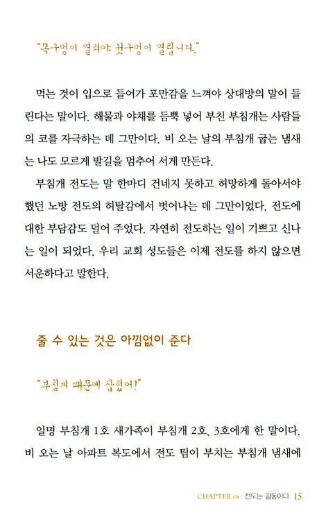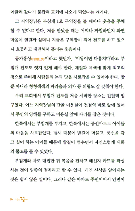 먹는 것이 입으로 들어가 포만감을 느껴야 상대방의 말이 들린다는 말이다. 해물과 야채를 듬뿍 넣어 부친 부침개는 사람들의 코를 자극하는 데 그만이다. 비 오는 날의 부침개 굽는 냄새는 나도 모르게 발길을 멈추어 서게 만든다. 부침개 전도는 말 한마디 건네지 못하고 허망하게 돌아서야 했던 노방 전도의 허탈감에서 벗어나는 데 그만이었다. 전도에 대한 부담감도 덜어 주었다. 자연히 전도하는 일이 기쁘고 신나는 일이 되었다. 우리 교회 성도들은 이제 전도를 하지 않으면 서운하다고 말한다.