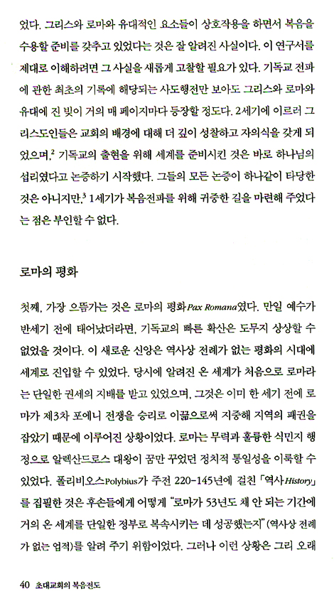 “이 책을 쓰는 동안 1세기와 2세기 문헌을 고찰하면서 내게 가장 인상적으로 다가왔던 것은 초기 그리스도인들이 품었던 순전한 열정이다. 그들은 복음이 진리라는 것을 뜨겁게 확신하고 있었다. 복음 없이는 어떤 사람이든 멸망할 수밖에 없다고 믿었다. 그들은 이 가련한 세상에 쏟아진 하나님의 사랑을 공유했다. 그리스도의 대위임령에도 주의를 기울였다. 아울러 그들은 자신에게 심오한 영향을 준 복음과 함께 사회에 침투하려고 애썼다. 기독교는 그들이 행하는 모든 일과 그들이 만나는 모든 사람에게 영향을 미쳤다. 교회생활은 대체로 다정스럽고 성장을 도모하는 분위기에서 이루어졌으며, 그런 환경은 좋은 소식을 들고 밖으로 나가도록 교인을 준비시키기에 안성맞춤이었던 것으로 알려져 있다. 평범한 그리스도인, 선교사, 학자, 여성 등 모두가 복음에 대한 뜨거운 헌신의 대열에 동참했던 것으로 보인다.”