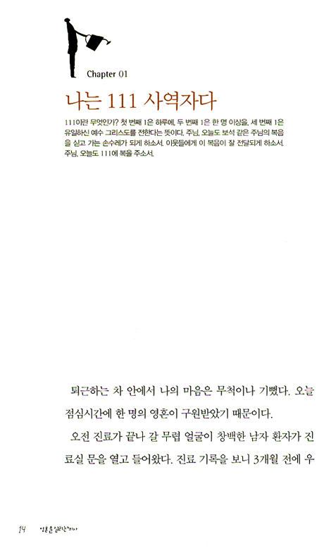 111은 ‘하루에 한 명 이상 유일하신 예수님을 전하자’이다. 장경문 장로는 매일 111을 실천하며 살게 해달라고 기도한다. 그는 날마다 환자의 상황에 맞는 전도법으로 전도하는데, 수많은 사람들이 그의 전도로 인하여 지역 교회로 인도 받아 생명을 얻었다. 그의 이야기를 통해 성도들은 소중한 사람들을 전도하는 방법을 배울 수 있다.