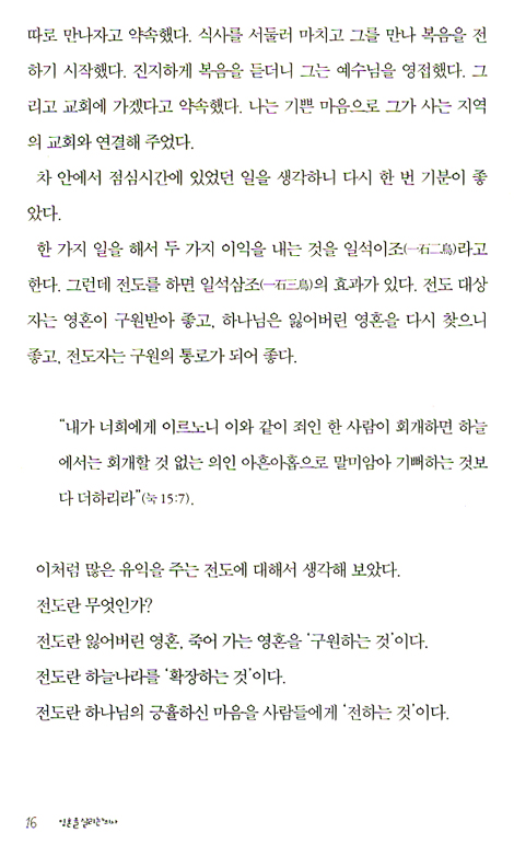 전도도 마찬가지다. 전도하는 현장에서 전도의 실재를 배우고 익힌다. 전도하면서 귀중한 경험을 쌓는 것이다. 실제 한 사람 한 사람에게 전도하는 것은 앞으로 있을 더 큰 사탄의 공격에 대비하여 예방접종을맞는 것과 같다.