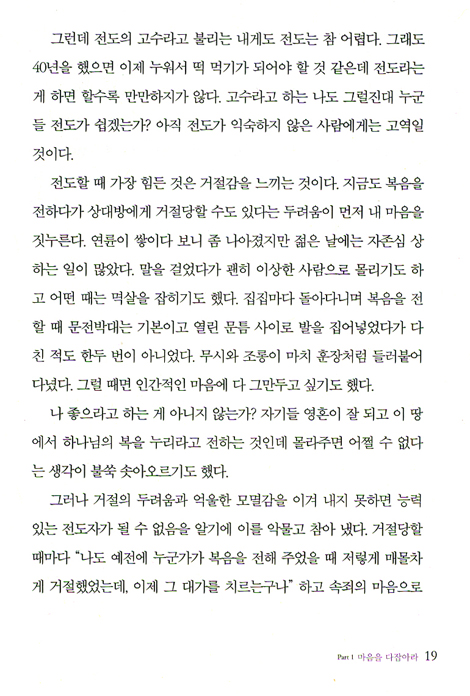 - 전도할 때 가장 힘든 것은 거절감을 느끼는 것이다. 지금도 상대방에게 복음을 전하다가 거절당할 수도 있다는 두려움이 먼저 내 마음을 짓누른다. 연륜이 쌓이다 보니 좀 나아졌지만 젊은 날에는 자존심 상하는 일이 많았다. 말을 걸었다가 괜히 이상한 사람으로 몰리기도 하고 어떤 때는 멱살을 잡히기도 했다. 집집마다 돌아다니며 복음을 전할 때 문전박대는 기본이고 열린 문틈 사이로 발을 집어넣었다가 다친 적도 한두 번이 아니었다. 무시와 조롱이 마치 훈장처럼 들러붙어 다녔다. 그럴 때면 인간적인 마음에 다 그만두고 싶기도 했다.