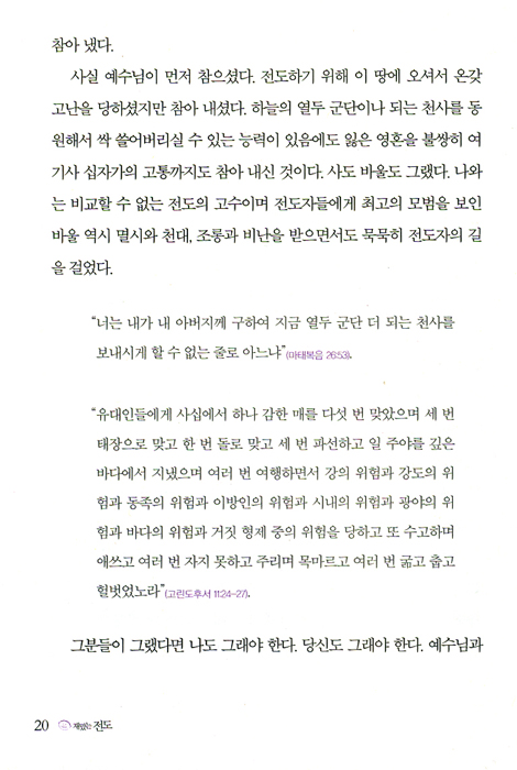 - 서곡(序曲)에 실망하고 돌아서면 웅장한 대작(大作)의 감동을 경험할 수 없다는 진리를 다시 한 번 마음에 새기길 바란다. 핍박과 고난의 서곡을 거친 전도자가 축복의 클라이맥스를 경험하는 것이다. 지치지 않는 철의 전도자로 살면 하나님께서 백 배의 축복을 주시고 영생의 축복도 주신다.