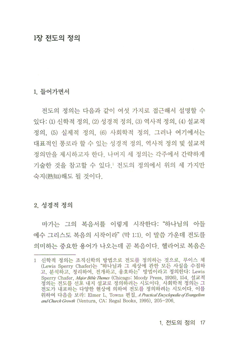 모든 학문은 그 학문을 소개하는 개론이 있듯이 전도학도 역시 개론이 있다. 『전도학 개론』은 전도의 많은 분야에 전문적으로 들어가기에 앞서 전도의 알파와 오메가를 개괄적으로 다룬다. 『전도학 개론』은 마치 멀리서 웅장한 숲을 감상하는 것과 같이, 전도의 모든 것을 한꺼번에 소개하는 내용이다. 그렇다고 그 내용이 상식 수준에 머무는 정도의 천박한 것은 결코 아니다.