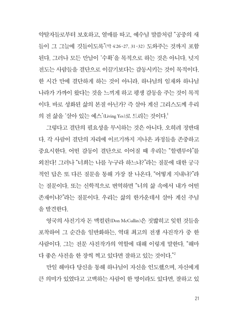 영화 <섀도우랜드>에서는 C.S. 루이스의 이런 말이 인용되기도 했다. “고통은 하나님의 확성기다.” 부활하신 주님은 책 속에서 찾으면 안 된다. 책은 주님의 수의요, 덮개이며, 북극성과 남십자성을 가리키는 주님의 나침반이다. 살펴보아야 할 곳은 사람들이 육신과 영의 상처로 아파하는 곳이다. 제자들이 부활하신 주님을 보기 원했다면 주님이 보라고 하신 곳을 보아야 했다. “너희가 여기 내 형제 중에 지극히 작은 자 하나에게 한 것이 곧 내게 한 것이니라”(마 25:40). 우리는 다른 사람들 안에서 그리스도를 볼 수 있는 능력으로 나중에 심판을 받을 것이다. 교회 신학의 많은 부분이 심판의 개념에 중점을 두고 있다. 심판의 요소가 있는 것은 분명하다. 즉 하나님은 유죄 판결을 내리시고 심판하시는 분이다. 그러나 예수님 사역과 교회 사역의 대부분은 법정의 배경에서 행해지지 않는다. 병원 같은 환경에서 행해지며, 건강과 치유에 관한 것이다. 우리가 고통당하는 사람들을 법정에서 병원으로 빨리 옮길수록 그리스도와 교회의 치유와 회복 사역에 더 빨리 가담할 수 있다.