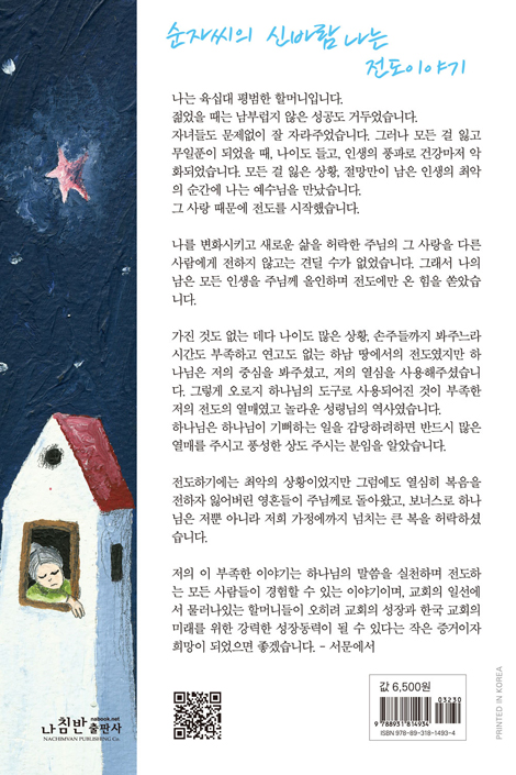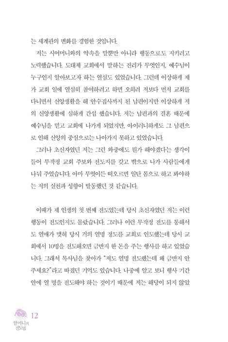 저의 이 부족한 이야기는 하나님의 말씀을 실천하며 전도하는 모든 사람들이 경험할 수 있는 이야기이며, 교회의 일선에서 물러나있는 할머니들이 오히려 교회의 성장과 한국 교회의 미래를 위한 강력한 성장동력이 될 수 있다는 작은 증거이자 희망이 되었으면 좋겠습니다. - 서문에서
