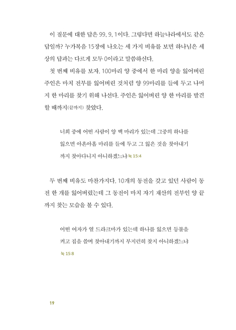 “열 손가락 깨물어 아프지 않은 손가락이 없다”는 옛말이 있다. 엄지든 중지든 약지든 모두 내 손가락이다. 열 자녀를 둔 부모가 사랑하지 않는 자녀가 없듯이 하나님은 우리 모두를 하나같이 사랑하셔서 한 영혼이라도 포기하지 않으신다.