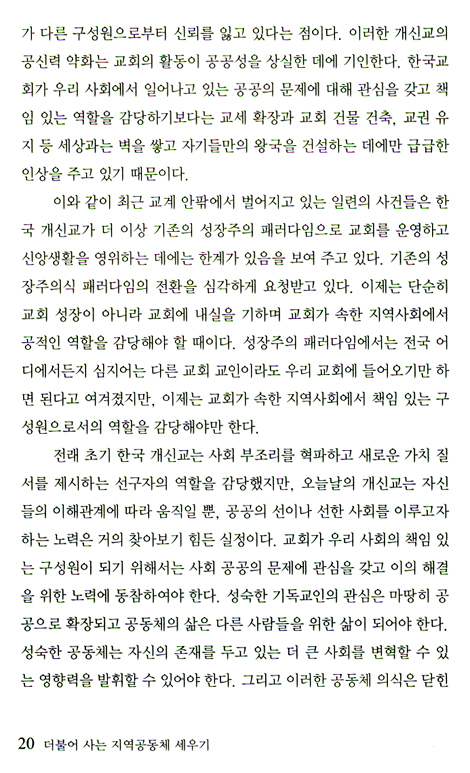 최근 교회들이 지역사회에 눈을 돌리기 시작하면서 시민사회와의 대화가 활발해지고 있다. 그것은 교회가 이 사회와 고립되어 존재할 수 없음을 심각하게 깨닫기 시작하면서 생긴 결과이고, 이러한 것에 대해서 시민사회가 기대를 갖고 반응을 보인 까닭일 것이다.
