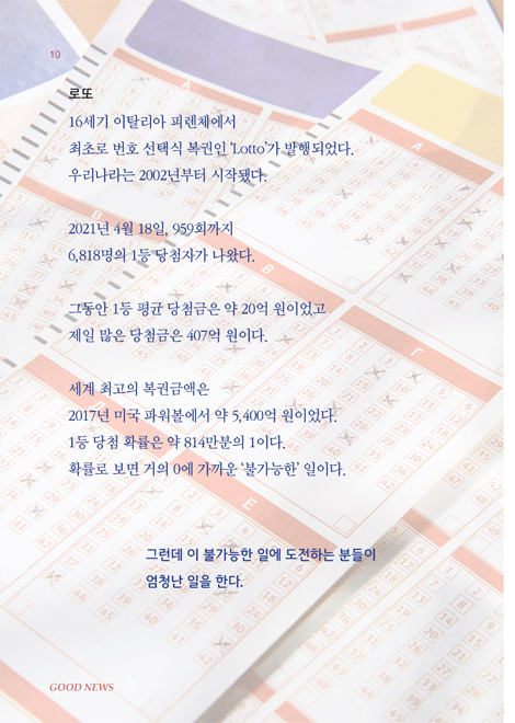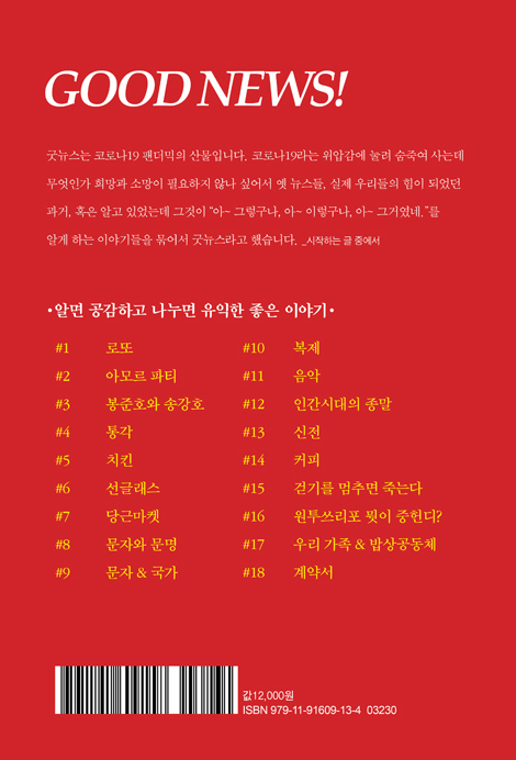 이 책은 코로나19 팬더믹의 산물입니다. 코로나19라는 위압감에 눌려 숨죽여 사는데 무엇인가 희망과 소망이 필요하지 않나 싶어서 옛 뉴스들, 실제 우리들의 힘이 되었던 과거, 혹은 알고 있었는데 그것이 “아~ 그렇구나, 아~ 이렇구나, 아~ 그거였네.”를 알게 하는 이야기들을 묶어서 굿뉴스라고 했습니다.