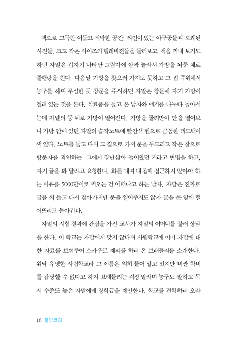 누구나 살아가면서 불안을 경험한다. 기술과 생활은 발전하는데 왜 인간의 마음은 갈수록 취약해질까? 이 책 [불안코칭]은 영화 속 불안의 얼굴을 통해 각자 자신을 돌아보아 일상의 불안을 다스릴 수 있도록 돕는 시네마코칭이다. 영화에 묘사된 주인공들은 생활에 어려움을 겪는 불안장애를 보여준다. 그런데 불안장애는 어느 날 갑자기 찾아오는 것이 아니다. 작은 일상의 불안과 두려움을 방치했을 때 불안은 점점 과도해지고 더 다루기 어려워진다. 그래서 우리는 불안을 알아야 한다. 영화에 자기를 비춰보고 각자 자신의 불안을 이해해보자. 이 책에서 살펴본 8개의 영화들은 모두 그러한 역할을 하는 훌륭한 거울이자 코칭 워크북이다. 각 장에 수록된 코칭 질문들을 잘 활용하면 마음과 생각에 긍정적인 변화를 만들어낼 것이다. 또한 [불안코칭]은 눈에 보이지 않는 불안과 씨름하는 사람들과 그 주변 사람들을 응원하면서 동시에 사람을 돕는 직업을 가진 사람들에게도 좋은 교재가 되어 줄 것이다. 사람은 불안과 두려움 속에서도 앞을 향해 나아가며 꿈을 포기하지 않는다. 그런 사람들을 위한 시네마코칭으로 비를 기다리는 가뭄의 때에 먼 하늘에 보이는 작은 조각구름과도 같은 희망을 함께 찾아보자.