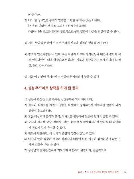 일반 푸드아트 테라피 수업은, 오랜 시간 동안(14년), 다양한 주제를 가지고 창작하고 실험하면서, 새로운 것들을 통찰하게 되었고, 많은 변화와 성장이 이루어지는 것을 보게 되었습니다. 다양한 사람들과(어린이 - 실버까지) 함께 해 보면서 그 효능성과 유익함을 실감하게 되었습니다. 이러한 푸드아트 창작의 장점을 성경 말씀과 접목하여 책을 출간하게 되었습니다.