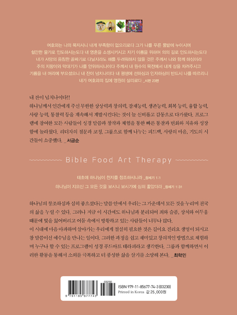 하나님의 형상으로 창조된 인간의 정체성을 지키며 다시 회복하며 예수 그리스도를 통한 끊임없는 새로운 지혜와 지식을 쌓고 생명의 양식을 먹으며 창조적이며 풍성한 삶을 누릴 수 있도록... 그러한 삶을 이루기 위한 또 하나의 훌륭한 창작작업이 바로 성경 푸드아트 테라피라고 자신 있게 말하고 싶다.