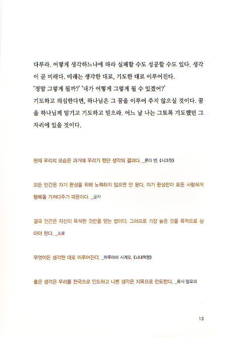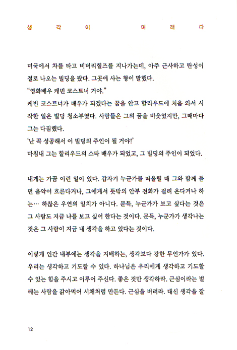 생각이 미래다_ 깜깜한 극장 안에 불이 들어오듯, 내게 배우가 다가오다_ 내 인생의 가장 빛나는 동아줄, 노력_ 오늘이 마지막이야_나의 재능을 발견하는 법_ 영화가 사명이 되기까지 _ 기봉이 아저씨처럼_ 좋은 영화에는 메시지가 있다_ 천국의 계단을 오르며_마지막 선물_ 하나님께 물들어 가다