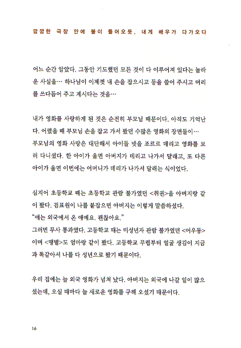 배우라서 행복하다_ 나의 달란트를 발견한다는 것_ 우리가 받아들여야 하는 두 가지_ 죽음도 훈련이 필요하다_ 나이가 든다는 것_ 보물 같은 기억들_ 커피보다 향기로운 그것_ 여행 중 책의 진짜 쓰임새는?_ 말씀을 본다는 것, 하나님을 만난다는 것_ 말씀으로 인도해 주시는 하나님_ 지금 생각해도 너무너무 잘 한 일_ 내 생애 가장 아름다웠던 크리스마스_ 용기 있는 미소_ 근신하며 산다는 것은_ 먼저 된 자와 나중 된 자_ 하나님을 증거한다는 것_ 믿음이와 오잉이의 대화_ 고래 심줄의 행복