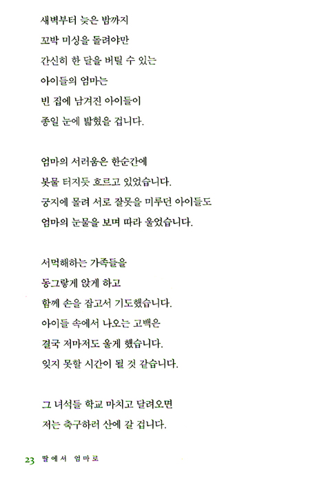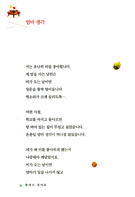 순하디 순한 글, 뭉클한 감동과 따뜻함이 담긴 글, 간결하고 정돈된 글 몇 줄이 이토록 마음을 가득 채워준다는 게 참으로 고맙고 신기할 따름입니다. 헌신의 삶으로 아름다운 본을 보여주신 작가의 친정어머니에게 박수를 보내드리고 싶습니다.