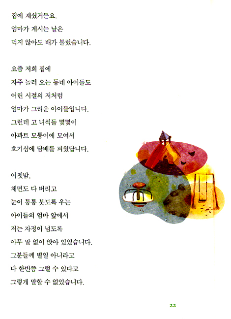 엄마가 새벽마다 나가시던 일터, 그 고된 공사현장은 비가 오는 날이면 쉬었다. 그래서 하늘이 흐린 날이면 나는 마음속으로 기도했다. “비야, 제발 많이많이 내려라. 우리 엄마 일 못하게….” 비가 내리면 일을 안 하는 대신 일당도 없다는 걸 나는 그때 몰랐다. 아니, 알았어도 좋아했을 거다. 그저 엄마만 집에 있다면 좋을 일이었다. 내가 흐린 하늘과 비를 좋아하게 된 이유는 그런 배경을 갖고 있다.