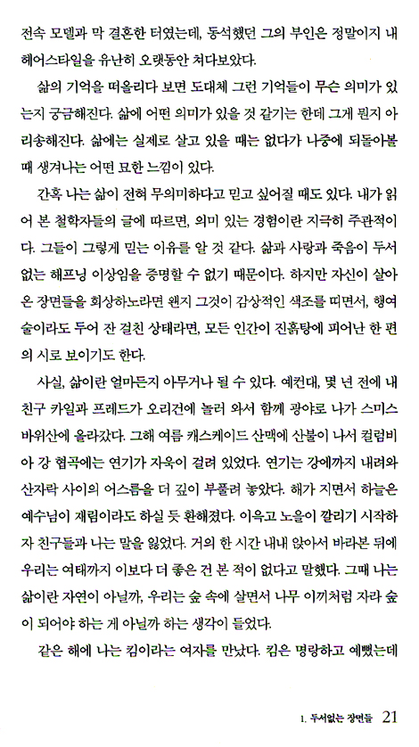하지만 내가 깨달은 게 있다. 나는 무의미한 영화를 보고 나오면서 ‘모든’ 영화가 무의미하다고 생각한 적은 없다. 지금 본 그 영화를 무의미하게 여겼을 뿐이다. 그렇다면 사람들이 삶이 무의미하다고 말할 때, 그 속뜻은 ‘자신의’ 삶이 무의미하다는 게 아닐까. 자신의 존재를 온통 시시하다고 믿기로 해놓고는, 그 칙칙한 삶을 나머지 우리 모두에게 투사하는 게 아닐까. _10. 세상의 저자