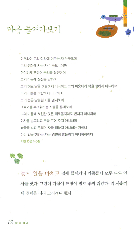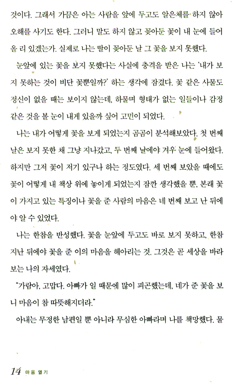 모든 것은 마음에 달려있다는 생각을 많이 하곤 합니다. 바쁜 일상 가운데 내 마음을 내려놓고 들여다보게 한 『마음열기』는 가쁜 호흡을 멈추고 잠시 쉬어가는 삶의 쉼표가 되어준 고마운 책입니다.