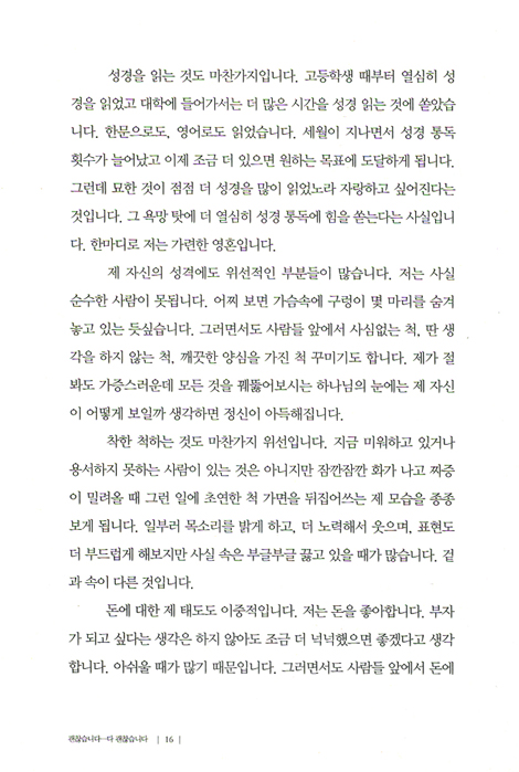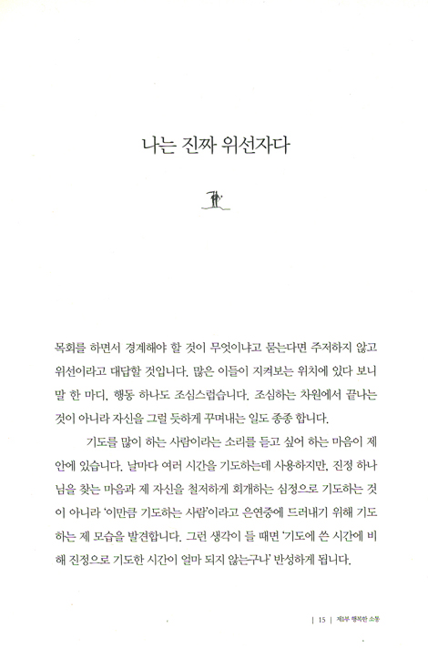 <나는 진짜 위선자다>는 글에서 “목회를 하면서 경계해야 할 것이 무엇이냐고 묻는다면 주저하지 않고 위선이라고 대답할 것입니다. 많은 이들이 지켜보는 위치에 있다 보니 말 한 마디, 행동 하나도 조심스럽습니다. 조심하는 차원에서 끝나는 것이 아니라 자신을 그럴 듯하게 꾸며내는 일도 종종 합니다.”라고 철저하게 자기반성을 하는 것을 보면, 저자가 낮은 곳에서 어려운 이들을 위해서 봉사하고 기도하는 삶을 철저하게 살고 있는 것을 엿보게 한다.
