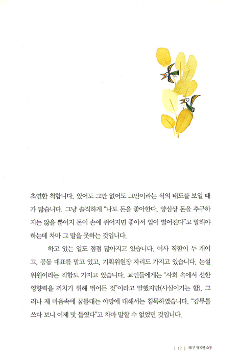 “가만히 제 자신을 돌아보면 다른 사람에 대해 참 많은 실수를 하며 살았구나 생각하게 됩니다. 상대방을 잘 알아보지도 않은 상태에서 특정한 딱지를 붙여놓고 그 딱지에 의해 그의 모든 것을 해석하곤 했으니까요. 지금도 그런 섣부른 태도가 남아 있기에 하나씩 벗겨내려고 합니다. 많은 것을 벗겨낼수록 더 많은 사람들을 얻을 수 있으리라 생각합니다.” <함부로 단정 짓지 말자> 41쪽