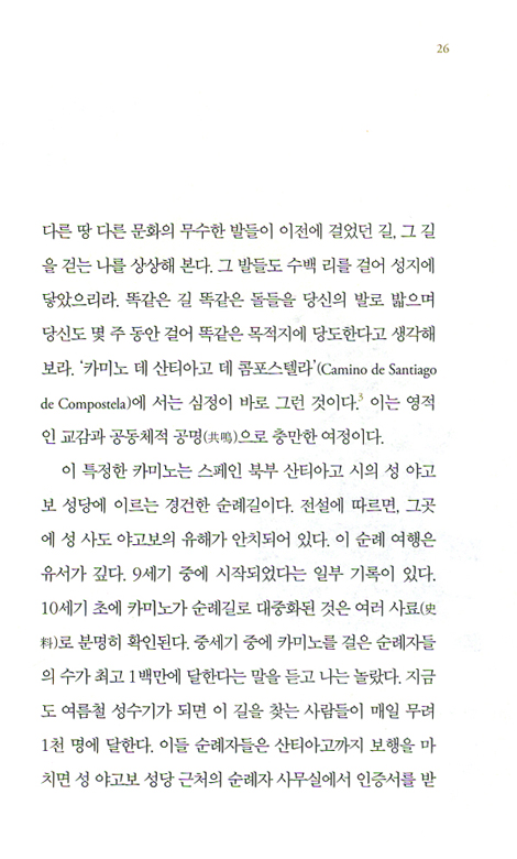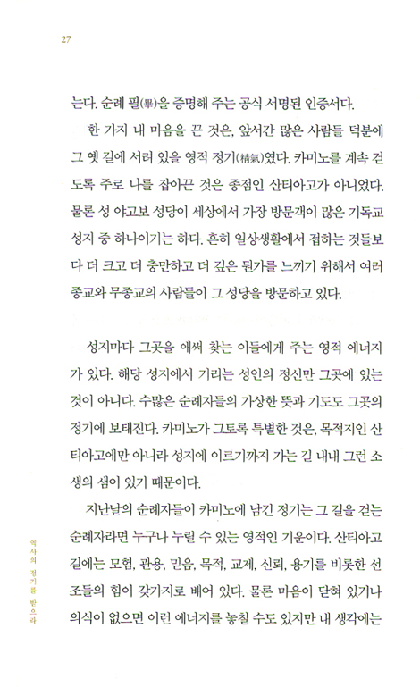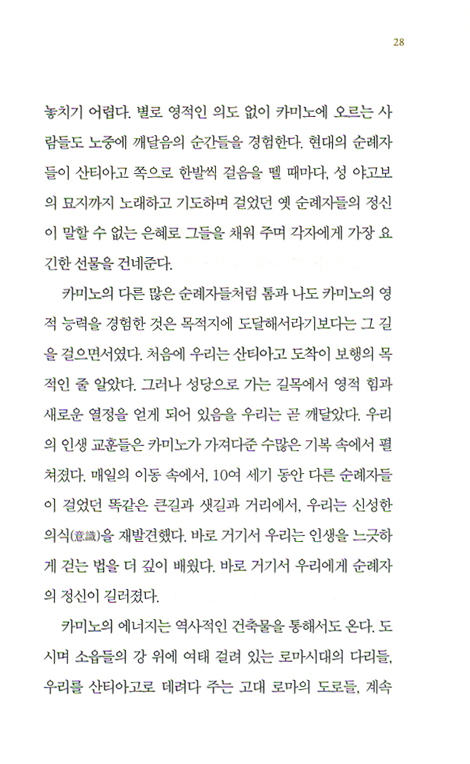 이제 나는 산티아고 순례를 마친 자로 이 책을 읽는다. 한 페이지 한 페이지가 새롭고 다시 나를 흔든다. 머물러 있지 말라고, 길에 나서라고, 우리는 이 세상에 정착하기 위해 온 것이 아니라 순례자로 살다 가는 거라고…… 기독교인이든 아니든 그와 같이 인생을 사는 사람이라면 일독을 권한다.