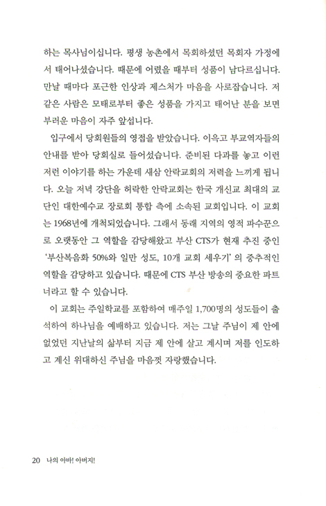 CTS 부산 방송 지사장인 김형수 목사의 '아버지'이야기. 누구에게나 아버지라는 단어는 특별하지만, 저자에게 아버지라는 단어는 애증이 교차하는 단어였다. 11살 되던 해에 아버지가 돌아가신 후 홀로 세상에 남겨진 고아처럼 처절한 인생을 살아야 했기에 결국 기찻길 육교 위에서 몸을 던지려 할 때 진정한 아버지가 찾아오셨다. 그 사랑하는 주님의 음성을 들은 후로 아버지와의 관계가 회복되었으며 지금은 전파 선교사로서의 사명을 감당하고 있다. 지난 50여 년 동안 하나님을 아버지로 증거하는 삶을 살아온 저자의 이야기는 독자들에게 큰 감동과 함께 관계 회복의 비밀을 전해준다. 이 책의 수익은 CTS 기독교 TV의 방송 사역과 아프리카 우간다 아이들을 위한 선교비로 사용된다.
