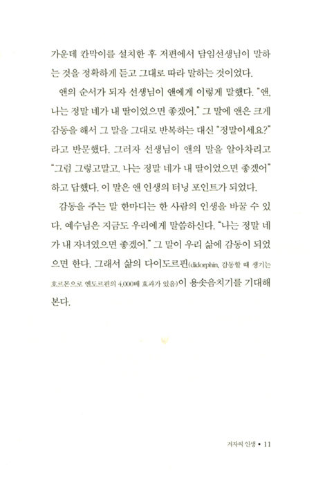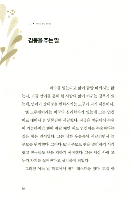 이 책에 담긴 내용이 여러분의 생각과 신념에 녹아드는 순간, 여러분의 삶은 틀림없이 긍정적으로 변할 것이다. 겨자씨처럼 비록 작은 씨앗이지만 큰 나무로 자라 열매를 맺고, 그곳에 새들이 쉴 수 있는 은혜가 임한 것처럼 나는 이 작은 책 한 권이 갈증을 느끼는 현대인의 삶에 생수 같은 존재가 되었으면 좋겠다.