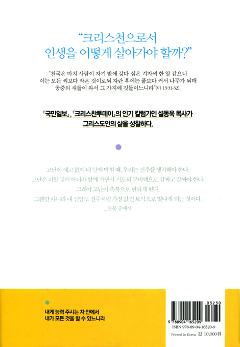 이 책에 실린 것은 모두「국민일보」,「크리스천투데이」에 발표한 것들이다. 개인적인 경험담도 있지만 역사상 수많은 사람들에게 영감을 준 고전적인 예화를 담았는데, 감동적인 사례들을 실생활에 적용하기 위해 성경에서 원칙과 통찰을 발견했고 그 말씀을 묵상하면서 나를 단련시켰다.