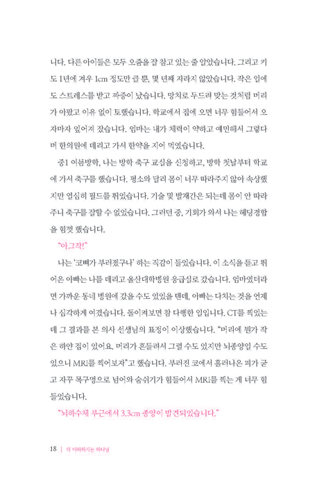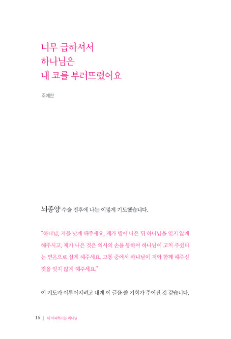 고난당하기 전에는 듣기만 했던 하나님을, 질병을 통해 만나게 되는 생생한 체험을 담은 글들이 읽는 이로 하여금 자신의 삶을 돌아보며, 하나님 앞에 무릎을 꿇게 합니다. 피와 눈물로 한 자 한 자 써내려간 글들을 통해 독자들의 삶에도 하나님이 주시는 위로와 사랑이 함께하시길 기도합니다.