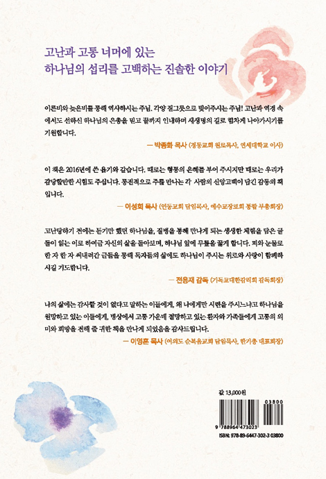 나의 삶에는 감사할 것이 없다고 말하는 이들에게, 왜 나에게만 시련을 주시느냐고 하나님을 원망하고 있는 이들에게, 병상에서 고통 가운데 절망하고 있는 환자와 가족들에게 고통의 의미와 희망을 전해 줄 귀한 책을 만나게 되었음을 감사드립니다.