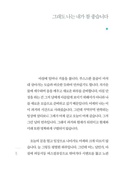 사랑받을 만한 자격과 가치로 똘똘 뭉친 사람은 없습니다. 모든 면에서 완벽한 사람도 없습니다. 마찬가지로 아무 데도 쓸모가 없는 사람도 없습니다. 단지 사랑받을 자격이 없다고, 쓸모가 없다고 믿는 사람이 있을 뿐입니다. 오늘 만나는 나를 어떤 눈으로 볼 것인지는 내가 정합니다. 오늘 내가 어떤 모습이든 그대로의 나를 사랑하는 것이 중요합니다. 오늘 만나는 나에게 ‘오늘의 나여서 고맙다’라고 말을 건네 봅니다. - 40쪽