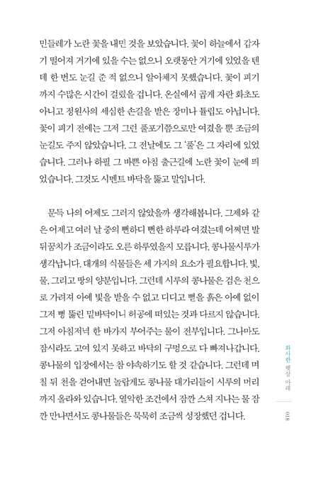 숲의 나무들이 어찌 모두 다 만족스러울 수 있겠습니까. 마음껏 옆으로 가지와 잎을 내고 하늘 위로 마냥 솟아오르고 싶겠지요. 그런데 옆의 나무들이 그 자리를 내주지 않으니 야속할 듯합니다. 그러나 자세히 살펴보면, 옆의 나무들이 자라날 수 있을 만큼의 공간을 서로 허락하면서 조화롭게 자신에게 허락된 만큼의 공간 안에서 겸손하게 그러나 당당하게 자랍니다. 그런 공존의 지혜와 양보가 없다면 숲을 이루지 못합니다. - 88쪽