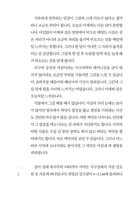 오아시스가 전혀 없는 사막은 상상하는 것만으로도 힘들고 버겁습니다. 사막이어도 오아시스가 있기에 왕래할 수 있고, 살 수 있습니다. 작은 바람이 있다면, 이 책이 바로 그 오아시스에서 만나는 길벗이었으면 합니다. 짧은 시간이지만 잠시 쉬며 대화하는 길벗이었으면 합니다. 왁자지껄 큰소리로 나누는 유쾌한 대화는 아니지만, ‘나’와 ‘우리’에 관해 소소하게 나누는 대화였으면 합니다.