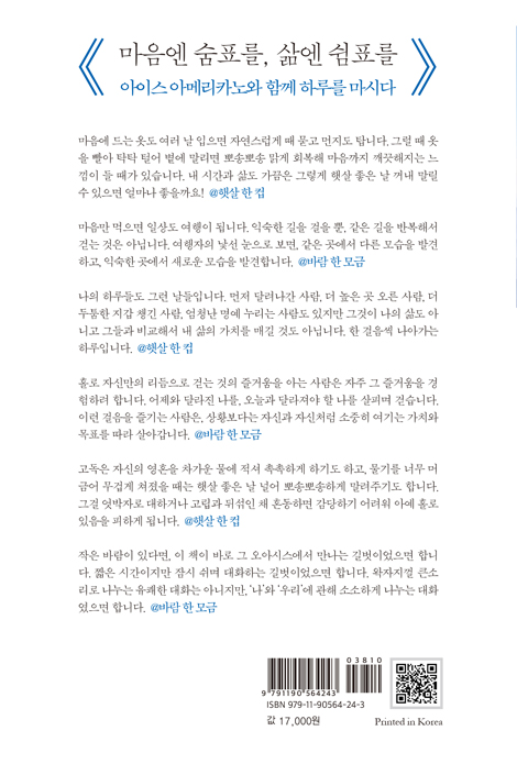 이 책이 소소한 우리 일상에 따스한 햇살 한 컵, 상큼한 바람 한 모금이 되며, 마음에는 숨표를, 삶에는 쉼표를 선물할 수 있기를 기대한다.