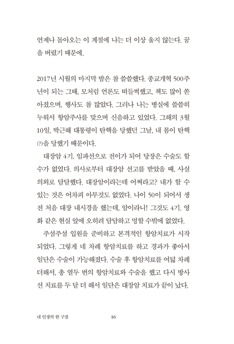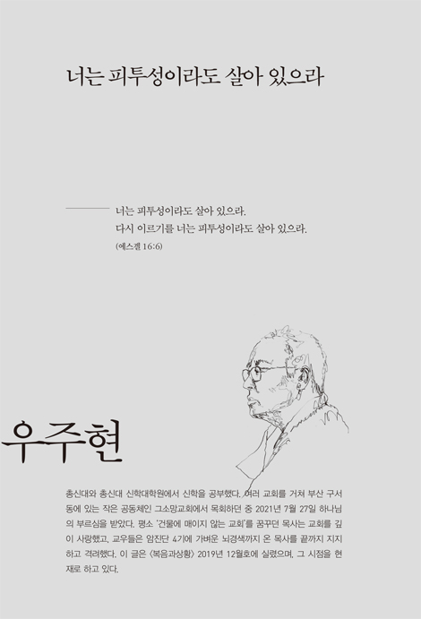 원고 청탁을 받고 과연 ‘내 인생의 한 구절’로 내세울 성경 말씀이 뭐가 있을까 고민했다. 그러다 떠올린 말씀이 에스겔서의 “너는 피투성이라도 살아 있으라”였다. 돌이켜 보면 총신대에 입학하여 신학이라는 길로 들어선 그 순간부터 나는 단 한 번도 행복한 적이 없다. 이미 언급한 대로 매일매일 살아내는 일들로 너무 버겁고 무거웠다. 학교생활도, 교회생활도, 생계를 유지하는 일도 모두 엄중하게 다가왔다. 게다가 암에 뇌경색까지….