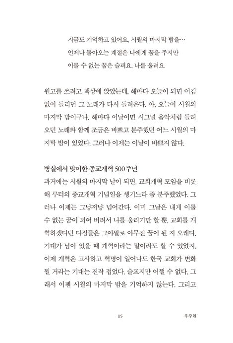 그렇게 기어이 하루하루를 살아오면서 이제야 깨닫는 바가 있다. 그건 바로 우리가 믿고 있는 이 복음이야말로 ‘실패자들을 위한 좋은 소식’이라는 것이다. 그리고 내가 믿는 하나님은 언제나 약함의 자리를 준비해 두시는 분이라는 사실이다.