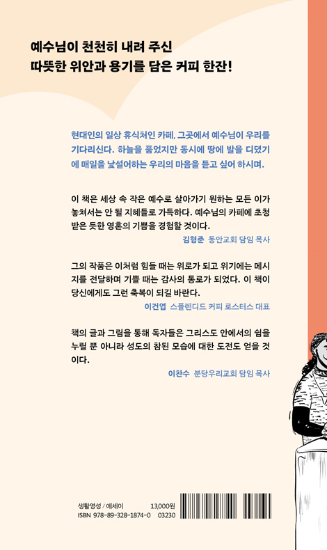 현대인의 일상 휴식처가 된 카페, 그곳에서 예수님이 우리를 기다리신다. 하늘을 품었지만 동시에 땅에 발을 디뎠기에 매일을 낯설어하는 우리의 마음을 듣고 싶어 하시며. 그 작은 카페에서 예수님은 잔잔한 미소를 띤 얼굴로 우리를 맞이하시고, 위안과 용기를 담아 천천히 내린 따뜻한 커피 한잔을 건네실 것이다. 이 책은 성도에게 예수님의 커피를 전한다. 이 한잔은 버거웠던 하루를 뒤로한 그들의 어깨를 토닥이며 위로를 전할 테고, 성도들이 하늘로부터 길러 온 생수를 타자에게 전하는 삶을 지속하도록 격려할 것이다.