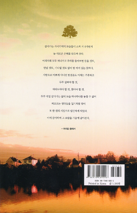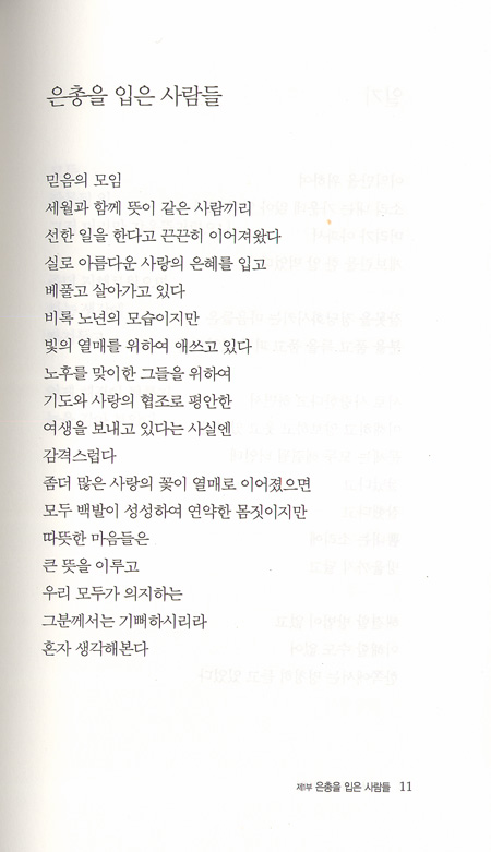 사방으로 바쁘게 다니던 발걸음도 이제는 주춤하고 두루 살펴야 할 것, 바라보아야 할 것, 찾아야 할 것, 두루 매일 살아가는 삶의 모습 하나하나를 놓칠 수 없어 떠오르는 생각들을 일기처럼 엮어 또 한 권의 시집으로 발간하게 되었다. 이에 감사하며 그 보람을 가슴에 담아본다.