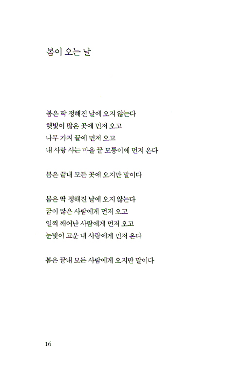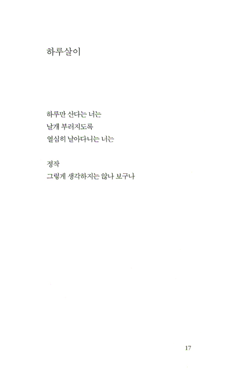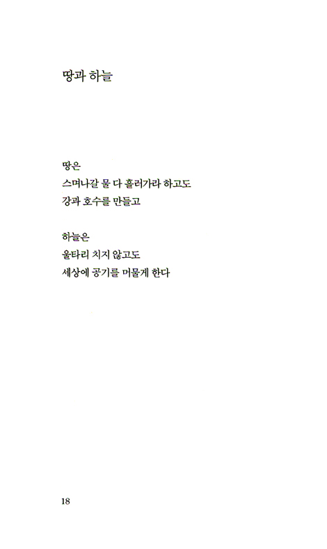 이 시집에 실린 작품들은 필자가 보기에 존재하련느 경향보다 전하려는 경향이 두드러진 듯하다. 비교적 비유나 기법에 덜 의존하고, 함축보다는 명료함을 추구하며, 주관적 정서보다 객관적인 진실을 지향한다. 그만큼 선이 분명하고 응숭깊다. 시인은 대상의 본질-궁극적으로 대상에서 발견하는 인생의 본질에 곧바로 육박한다. 그 대상은 자연물인 경우가 많으며, 표현은 매우 절제된다. 시인은 익숙한 자연물들에서 삶의 진실을 새롭게 읽어낸다.