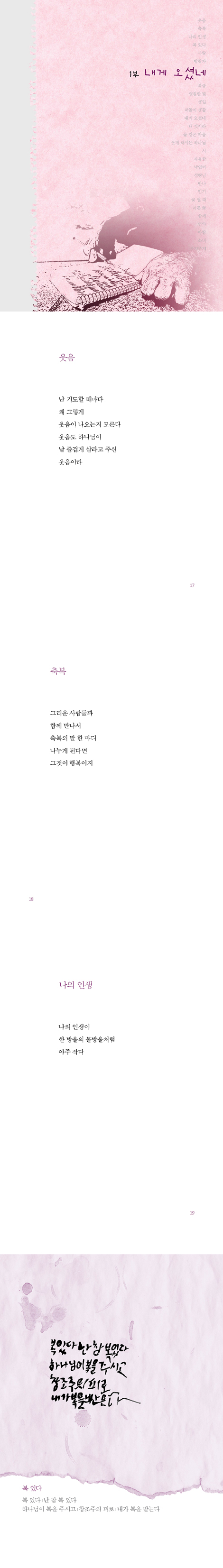 처절한 삶의 굴레와 결박을 풀어내는 강력한 하나님나라가 그에게 임한 것이다. 골초였던 그가 담배를 끊었을 뿐 아니라 시와 삶 자체에 큰 변화가 나타났다. 뒤틀리고 굳은 자기 몸 하나 유지하기 어려웠던 친구가 다른 약하고 아픈 이들을 섬기고 세우기 시작했다. 다른 누구, 무엇보다도 재완이의 변화는 내게 성령님의 역사를 실제적으로 알게 하는 표본標本이었다. ‘니코틴 정’이 이젠 ‘성령 시인’으로 변모했다.