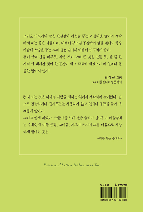 한 통의 편지가 외로운 이들의 마음을 얼마나 따뜻하고 힘 있게 하는지 경험했기에 저자는 40여 년간 부지런히 사랑으로 위로와 격려와 축복의 편지를 써 왔다. 간편하고 신속한 전자우편이 보편화 되어도 손편지를 쓰고 우표를 붙여 우체통에 넣었다. 그렇게 하면서 저자는 수취인을 존경하고 감사하며 그들을 위해 기도하고 사랑하게 되었다고 고백한다. 외롭고 힘든 이들에게 위로와 용기와 희망을 준 편지들과 “밋밋한 인생, 회색빛 시간들을 훌륭한 예술품으로 가꾸어 가고 싶어” 하는 저자가 자연과 사람들과 사건 그리고 하나님을 만나 느끼고 생각해 표현한 시들이 이 책에 실려 있다. 하나님과 공동체의 온기와 향기를 전해 준다.