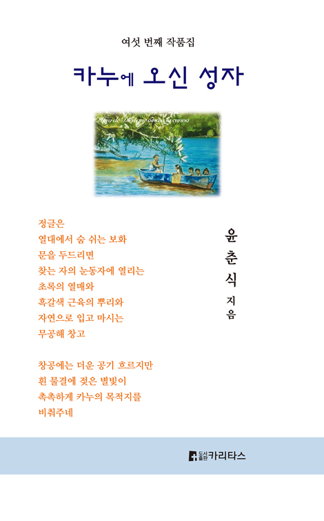 이번 6집은‘기쁜 망고’로 표현해 보고자 했다. 그렇지만 제 5집의 제목을『슬픈 망고』로 펴내었기에 너무 목적 지향이라는 생각이 들게 되었다. 이것이『카누에 오신 성자』로 정하게 된 배경이다. 그러기에 이번 선집은‘슬픈 망고’에 관한 소재의 변화요 회복이다. 푸름과 태양의 주황빛이 어우러진 희망찬 망고로써 독자들을 정글에 머물게 하는 자력磁力을 선보이게 될지도 모른다.