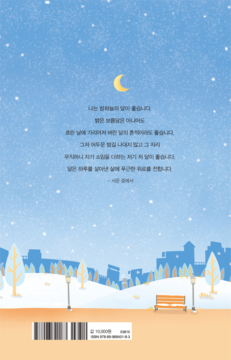 강원도 산천어 축제로 유명한 화천에서 목회하는 시인은 “그저 어두운 밤길 나대지 않고. 그 자리, 우직하니 자기 소임을 다하는 저기 저 달이 좋습니다. 달은 하루를 살아낸 삶에 푸근한 위로를 전합니다”라고 하면서 달은 하루를 살아갈 삶에 묵묵한 응원으로 희망을 전한다고 말한다.