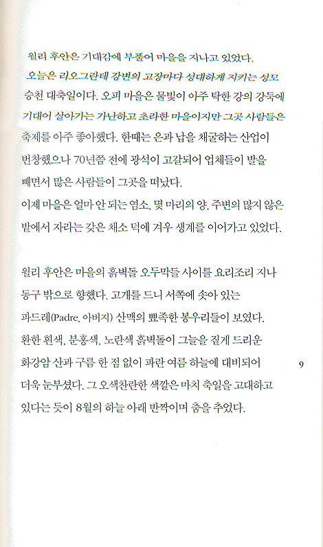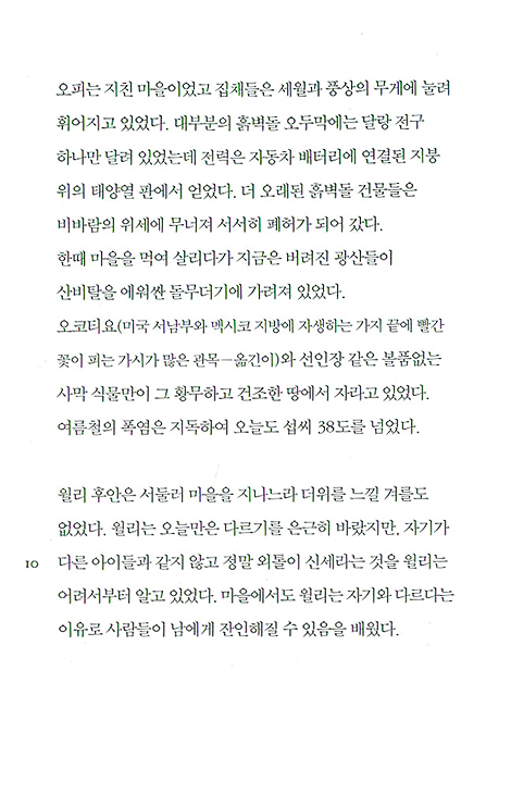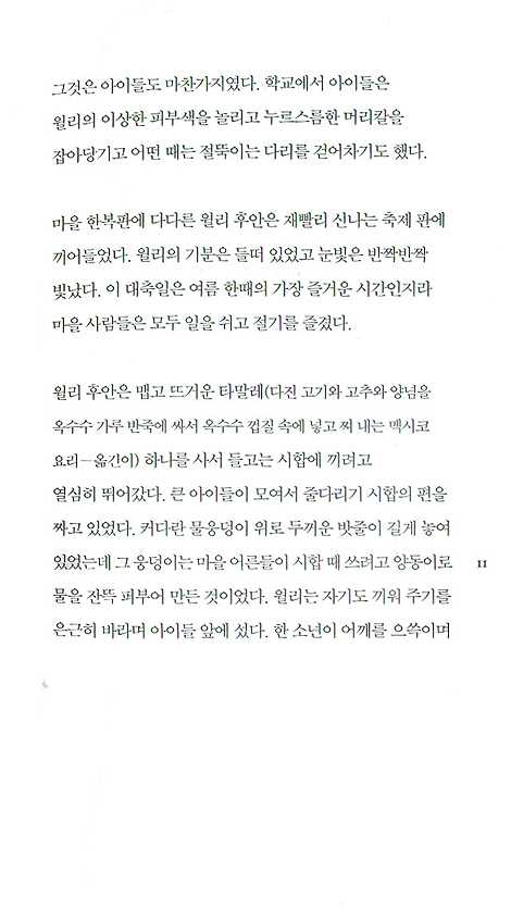 “윌리 후안은 아이들의 웃음을 피해 혼자 저쪽으로 갔다. 윌리는 울지 않았다. 아이들이 그냥 장난으로 그런 것이라고 자신을 타일렀다. 하지만 매번 장난의 봉이 된다는 것은 즐겁지 않았다.” (12쪽)