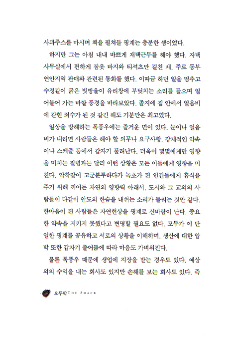 「오두막」은 어두운 시대의 절망을 이겨내는 가족의 거처이며 영혼의 거처이다. 현대인의 마음속에서 허물어져가는 사랑과 용서의 자리는 그곳에서 아름답게 복원된다.